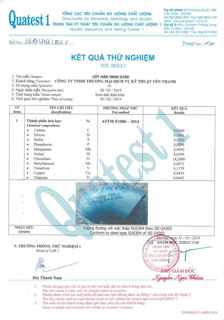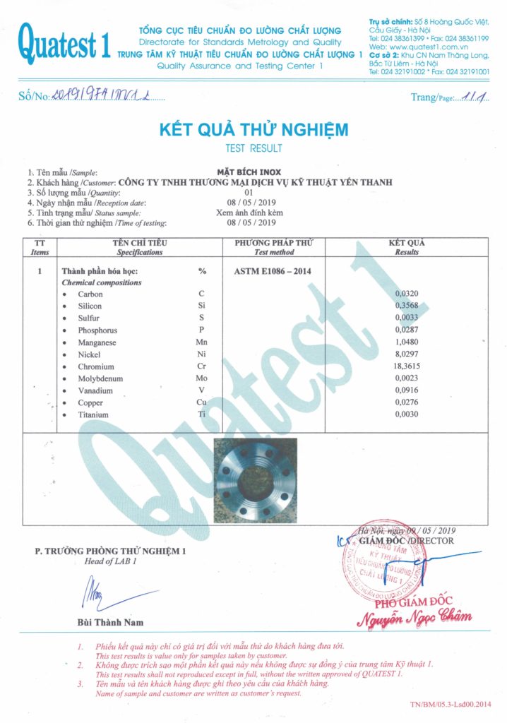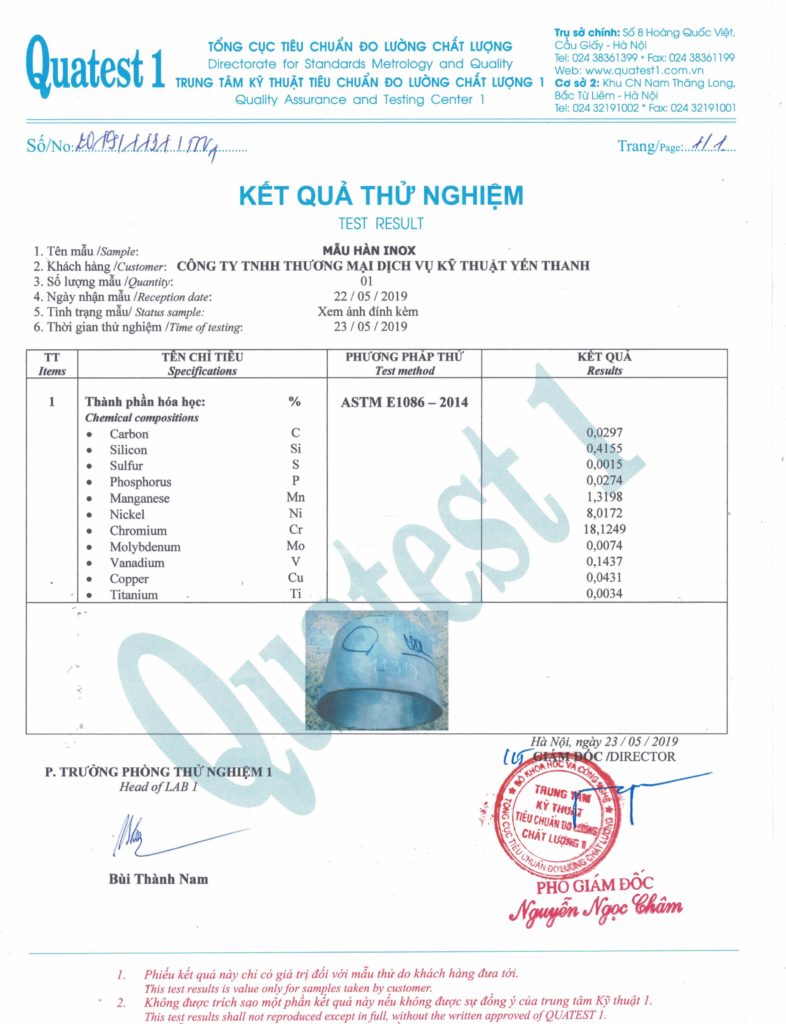 Vì vậy, Phương pháp để xác định chính xác nhất các loại inox đó là kiểm tra thành phần hóa học. Tại Việt Nam, để kiểm tra chính xách nhất chúng ta có thể mang sản phẩm Tổng cục tiêu chuẩn đo lường chất lượng Quatest 1 tại số 8, Hoàng Quốc Việt, Hà Nội hoặc Quatest 3 tại số 49 Pasteur, Quận 1, HCM để xác định thành phần hóa học. Dưới đây là một số bản test thành phần do Inox Yến Thanh thực hiện: